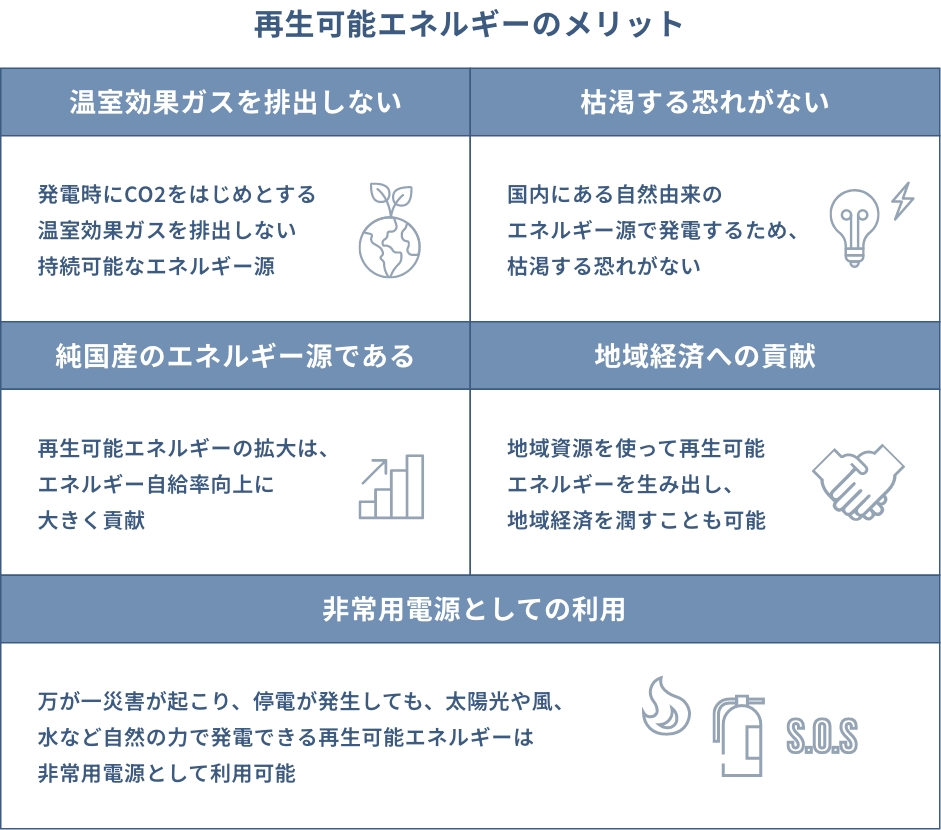 日本は今、温室効果ガスの排出量をゼロにする脱炭素社会の構築に向けて、「2050年カーボンニュートラル」の実現に取り組んでいます。「カーボンニュートラル」と「エネルギー自給率の向上」を同時に達成できるのが、再生可能エネルギーです。現在の日本において再生可能エネルギーが持つ以下の5つのメリットが特に重要となっています。
