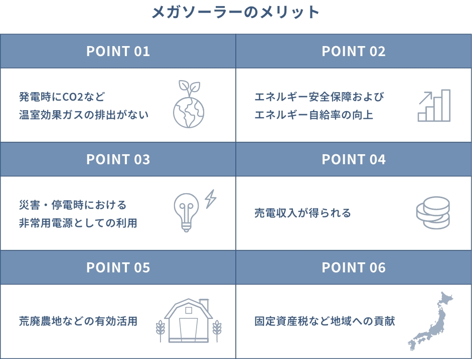 メガソーラーには温室効果ガスの排出削減のみならず、さまざまなメリットがあります。