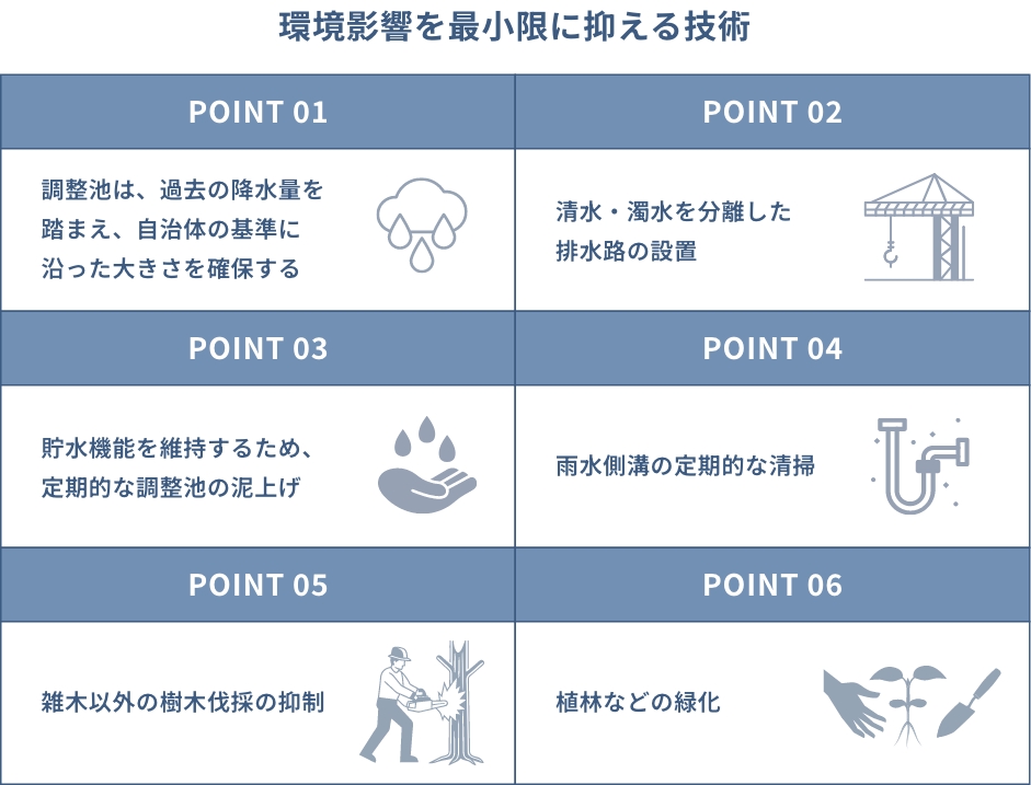 泥水や土砂などの流出防止に向けて、調整池の設置などの防災工事、排水溝設置などによる排水対策、盛土・切土やのり面の保護対策にどう取り組むのか。地域住民に事前に説明しておくことが重要です。