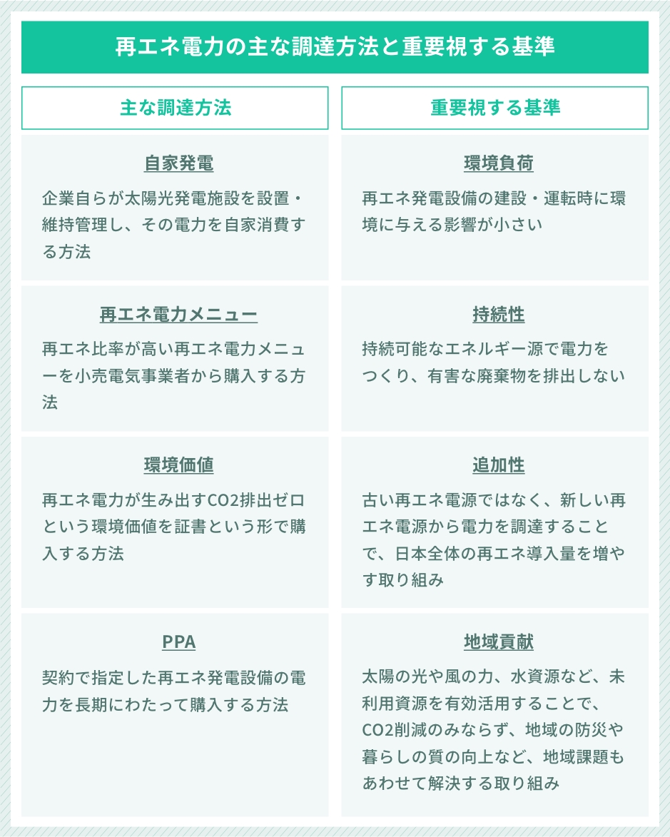 企業が再エネを調達するうえで、重要視する基準が次の4つです。
