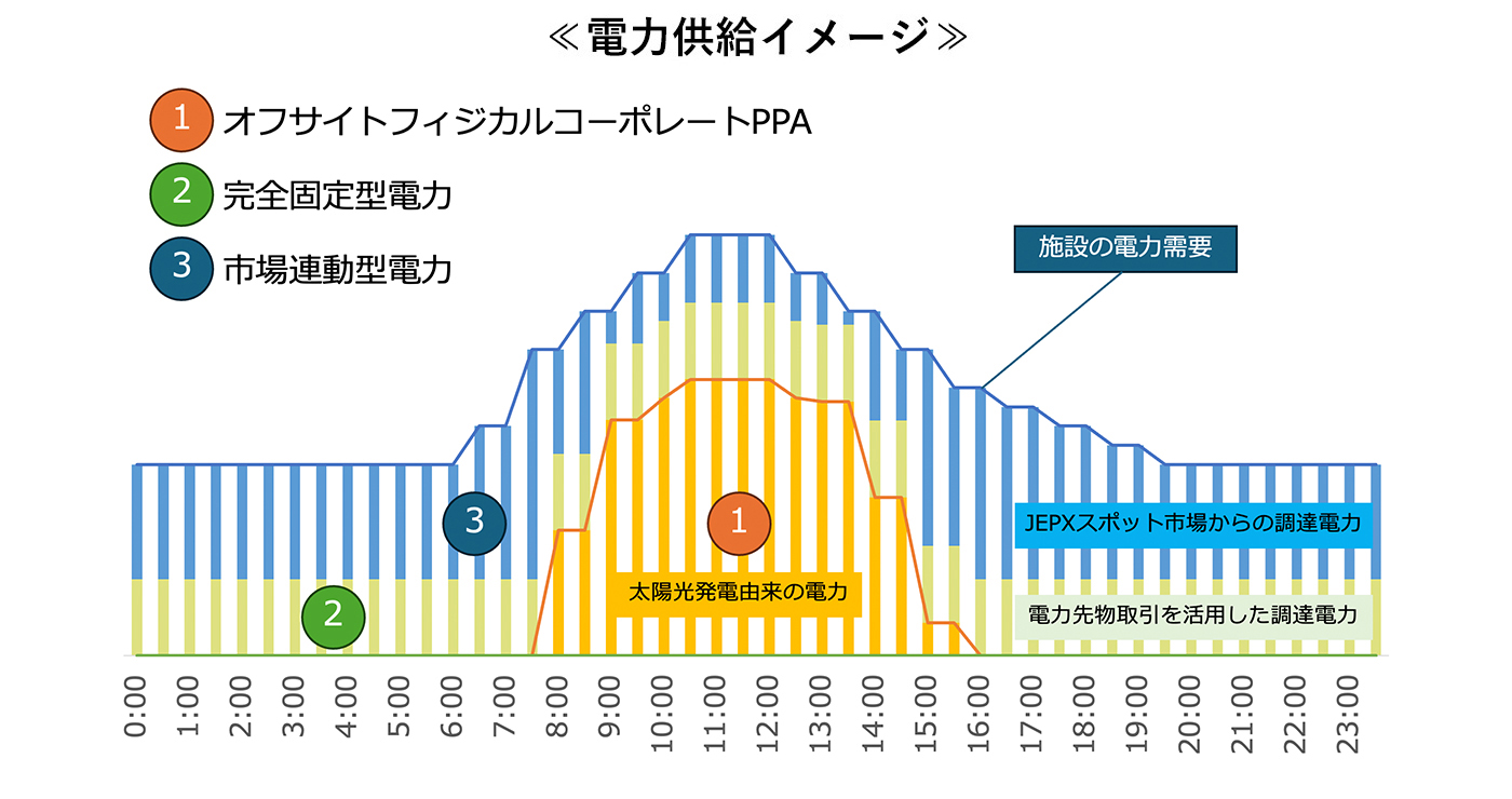 本取組みにおいては、オフサイトPPAによる再エネ調達に加え、負荷追随部分では電力先物市場を活用した完全固定メニューと日本卸電力取引所(JEPX)のスポット市場価格に連動する市場連動メニューの2つの料金体系を組み合わせた料金設計としています。負荷追随部分の固定調達割合を柔軟に設定可能とすることで、リスク許容度に応じた電力調達戦略に対応します。市場価格下落による電気料金削減メリットを享受しつつ市場価格上昇による電気料金上昇リスクも一定程度抑制したいという2つのニーズに対応可能です。これらにより、脱炭素推進と電気料金削減の両立を実現しました。