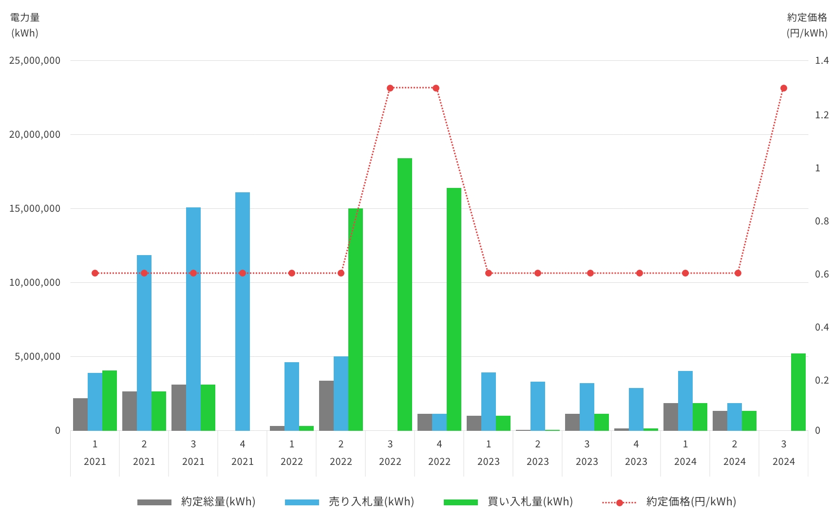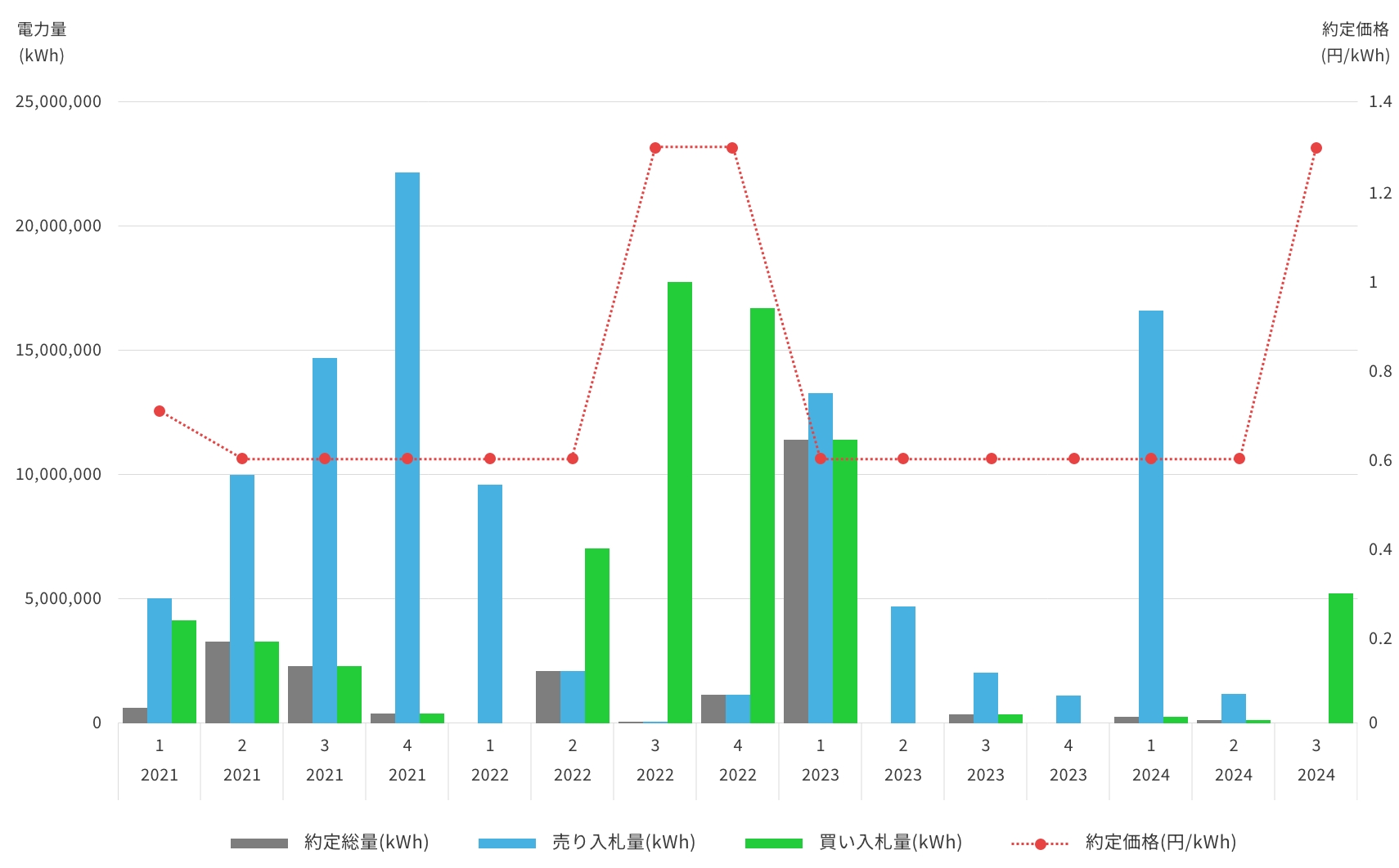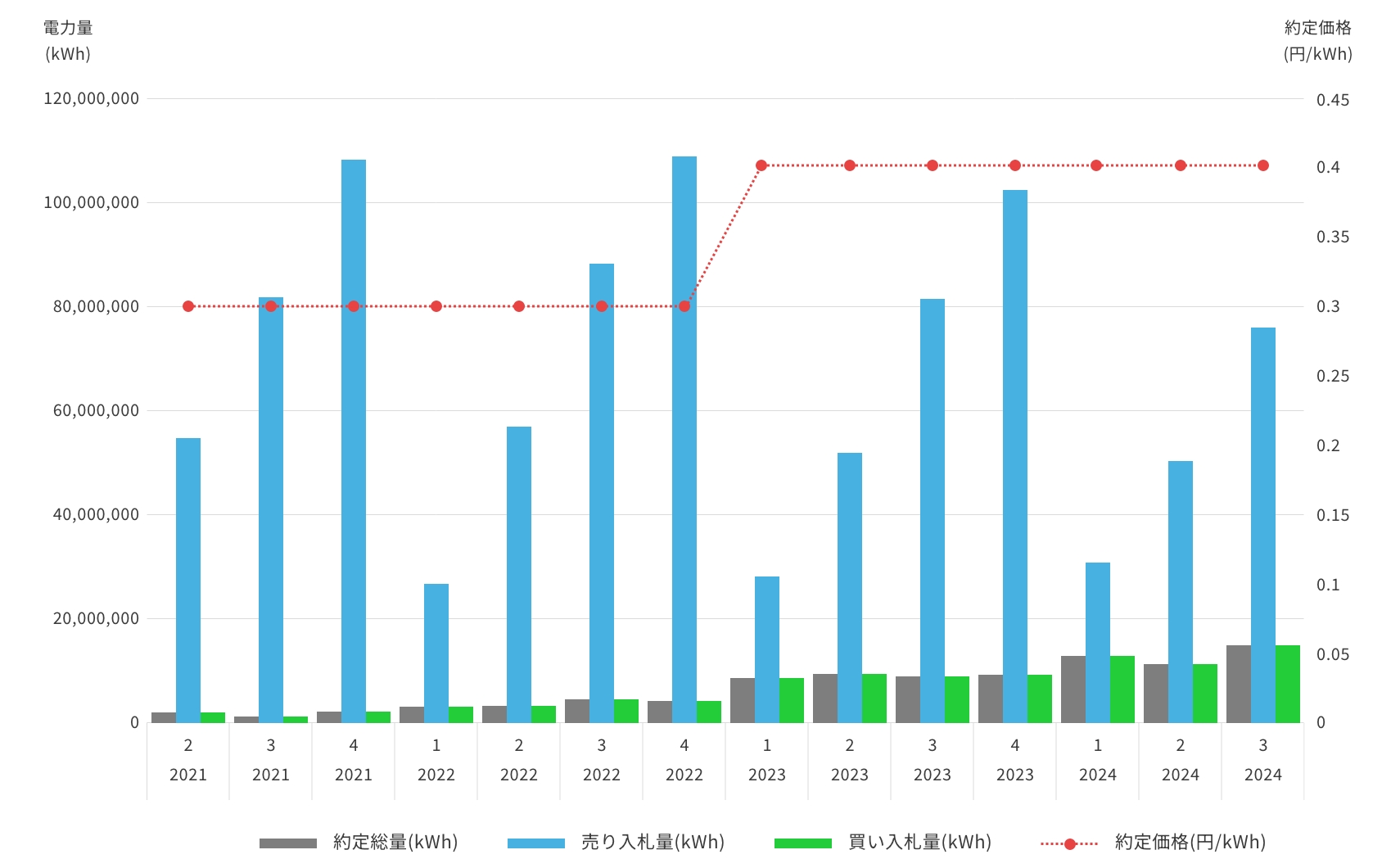 約定量は年々増加傾向であり、2024年度第3回オークションでの約定量は過去最高の約153億kWhとなりました。また売り入札量が買い入札量を大きく超えるため、直近の約定最安価格は0.40円/kWhと低位安定しています。