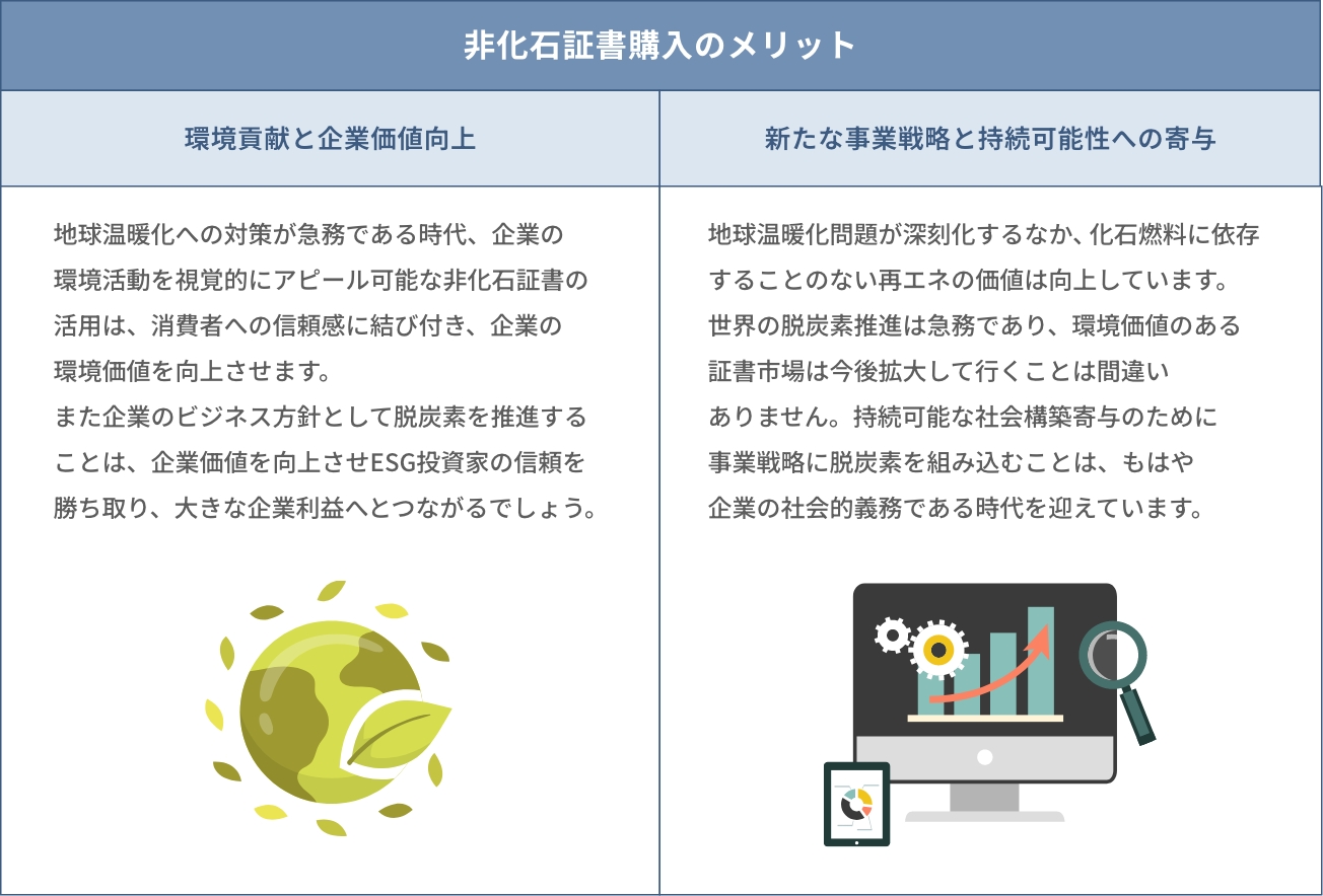 - 非化石証書購入のメリット:①環境貢献と企業価値向上