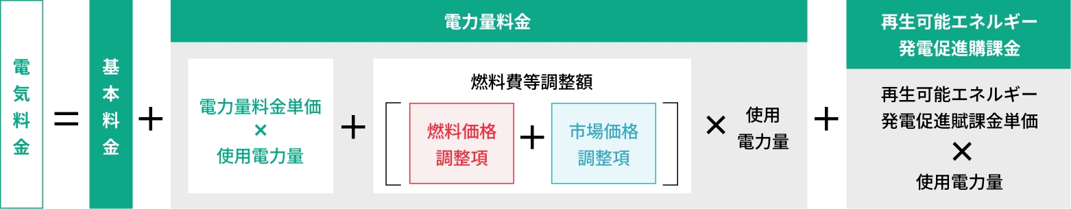 一般的な電気料金メニューには基本料金と電力量料金だけでなく、燃料費等調整額なども含まれており、電力会社は下図の算定方法から電気料金を算定しています。(※燃料費等調整額を適用しないメニューもあります。)