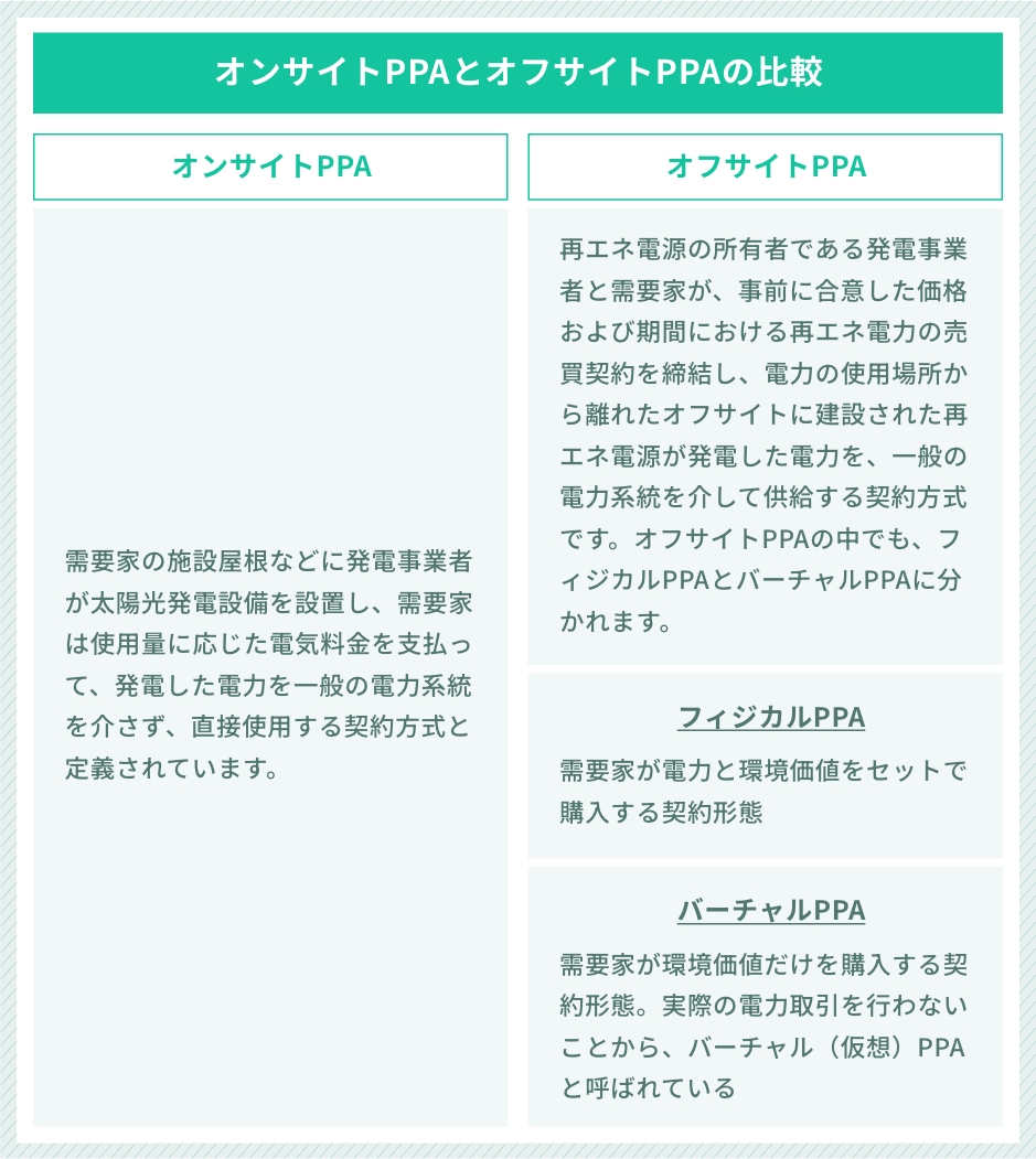 さらにオフサイトPPAには、フィジカルPPAとバーチャルPPAの2種類があります。